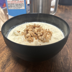材 料:うどん(1玉)、鶏ひき肉(100g)、砂糖(少々)、調味塩(適量)、ゆず胡椒(適量)、豆乳(200cc)、鶏ガラスープの素(適量)、すりごま(適量)、
