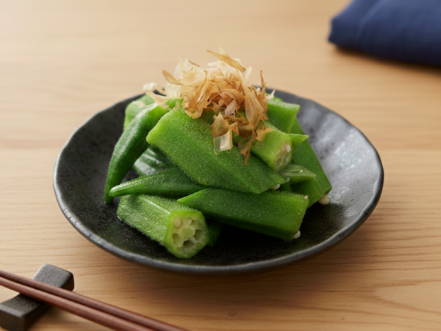 簡単美味しい おくらのレンジ蒸し 分量 2人分 材料 おくら10本塩適量A)白だし小さじ1/2A)ごま油3滴調味塩適量鰹節適量 作り方 1、おくらを塩もみする。2、ガクの部分でヘタを切り落とし、半分に切る。3、おくらを耐熱容器に入れ軽くラップをし、1分半程レンジで加熱する。4、おくらにAを入れ混ぜ、調味塩で味を調える。5、小皿に盛りつけ、鰹節を乗せたら出来上がり。