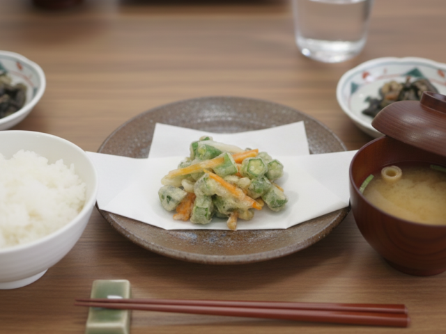 1、おくらはガクを取り輪切り、玉ねぎは薄切り、にんじんは千切りにする。
