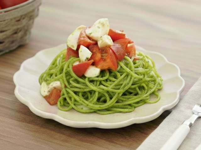 4、パスタ、とまと、チーズをお皿に盛りつける。