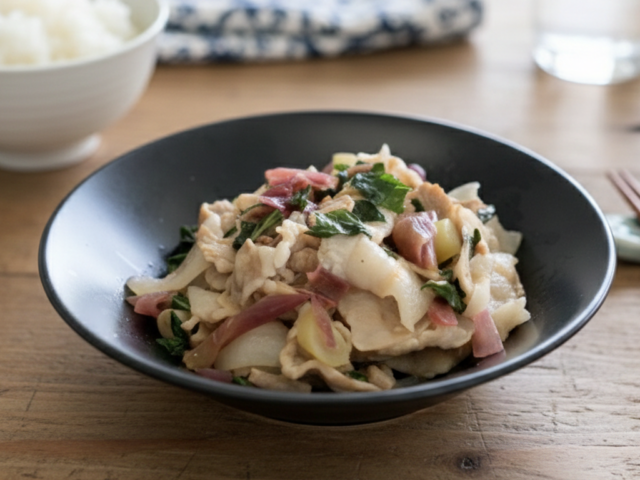 大葉の色どりがステキ 豚バラとみょうがの茎の大葉炒め 分量 2人前 材料 豚バラ肉140gみょうがの茎ひと掴み大葉8枚だし醤油大さじ1杯レモン果汁大さじ2杯 作り方 1.豚バラを食べやすい大きさにカット2.1に大体火が通ったら、ざっくり切った茎みょうがと粗く刻んだ大葉を加えてさっと炒める。3.だし醤油とレモン果汁で味つけする。