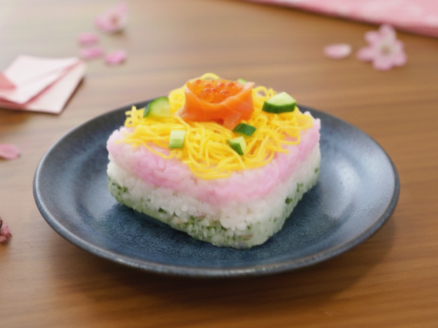 5、お寿司の上に綿糸卵、サーモン刺身、いくら、きゅうりで飾り付ける。