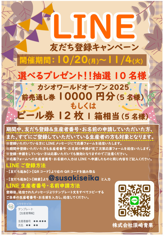 LINE友だち登録キャンペーンのお知らせ 2025.10.20 生産者の皆様へ 10/20(月)~11/4(木)まで 須崎青果のLINEの友だち登録&生産者番号・お名前の申請をしてくださった方から 抽選合計10名様にプレゼントするキャンペーンを実施いたします! 景品は・・・ カシオワールドオープン2025前売り券10000円分 ★5名様分★ もしくは ビール券12枚(1箱相当)★5名様分★ すでに登録いただいている方も対象となります! LINEにて応募フォームを送信いたしますのでぜひご応募ください✨ 株式会社須崎青果