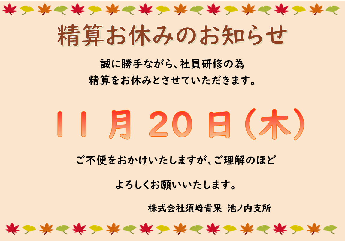 池ノ内支所 精算お休みのお知らせ 2025.11.01 生産者各位 誠に勝手ながら、社員研修の為精算をお休みとさせていただきます。 ご不便をおかけいたしますが、ご理解のほどよろしくお願いいたします。 【精算お休み】 11月20日(木) 株式会社須崎青果 池ノ内支所 寺本