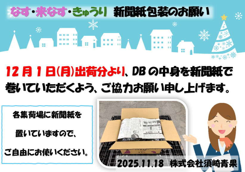 毎年この時期にご協力いただいております新聞紙による包装と、高品質な青果物を出荷していただいておりますことに、重ねて厚くお礼申し上げます。