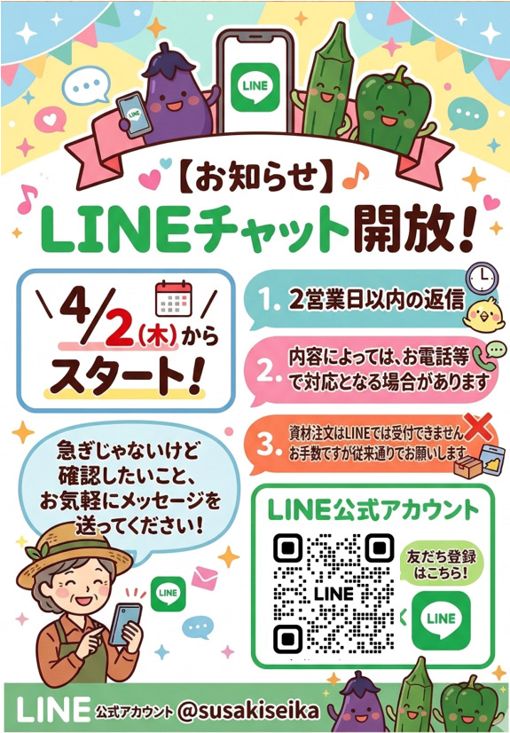 資材のご注文について LINEチャットでの資材注文は承っておりません。お手数をおかけいたしますが、注文に関しては従来通りの方法にてお願いいたします。